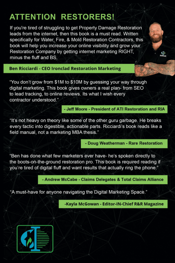 Whether you are a Water, Fire, or Mold Remediator, a Storm Damage Restoration Contractor, or have an Indoor Air Quality Business, this book has the plan for you to DOMINATE online to increase your leads the RIGHT way. This is a complete overview of what it takes to get more Leads, Calls, and of course revenue for your Restoration Business (minus all the fluff, dead ends, and BS you’ve probably grown accustomed to getting when it comes to marketing your business)